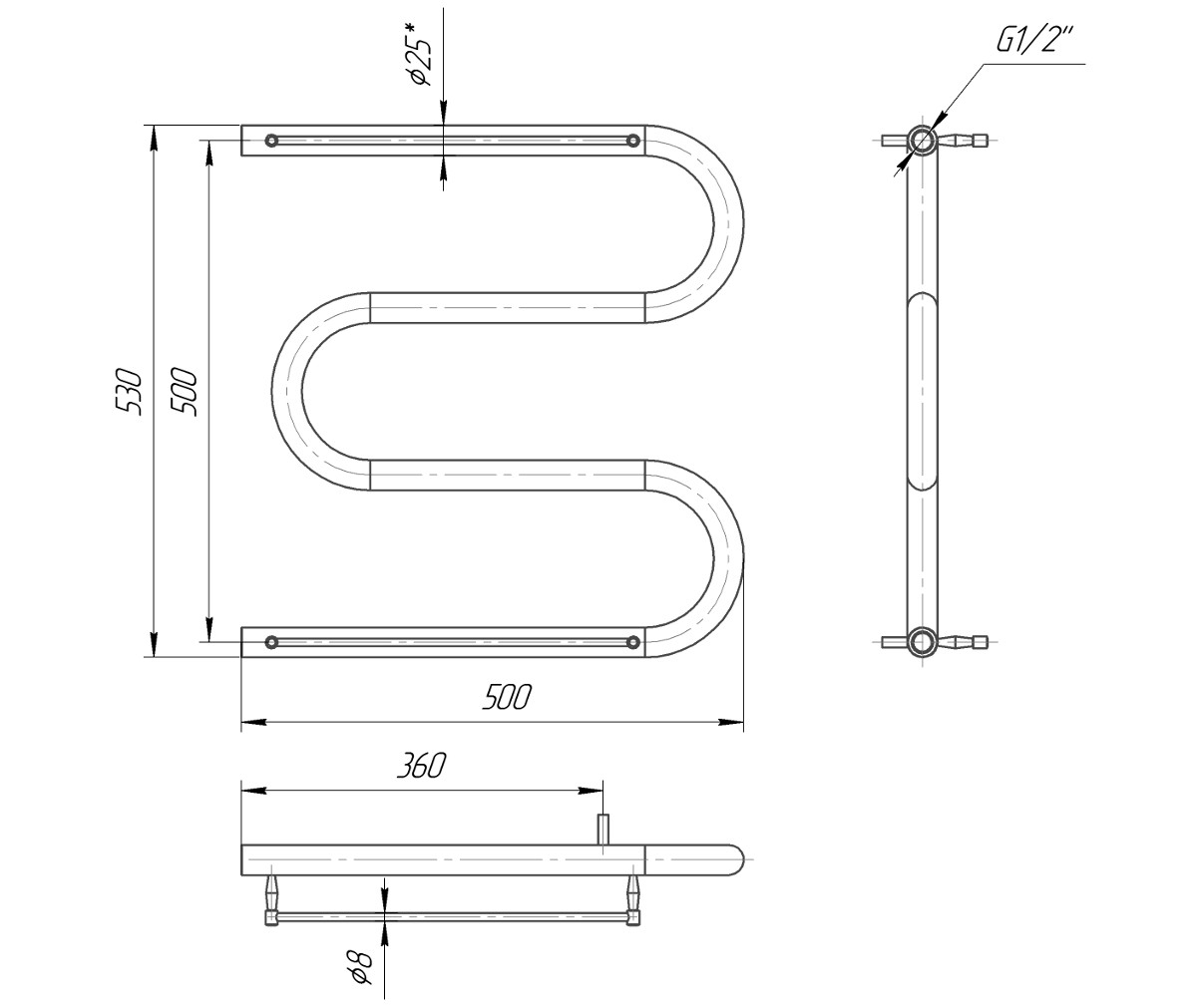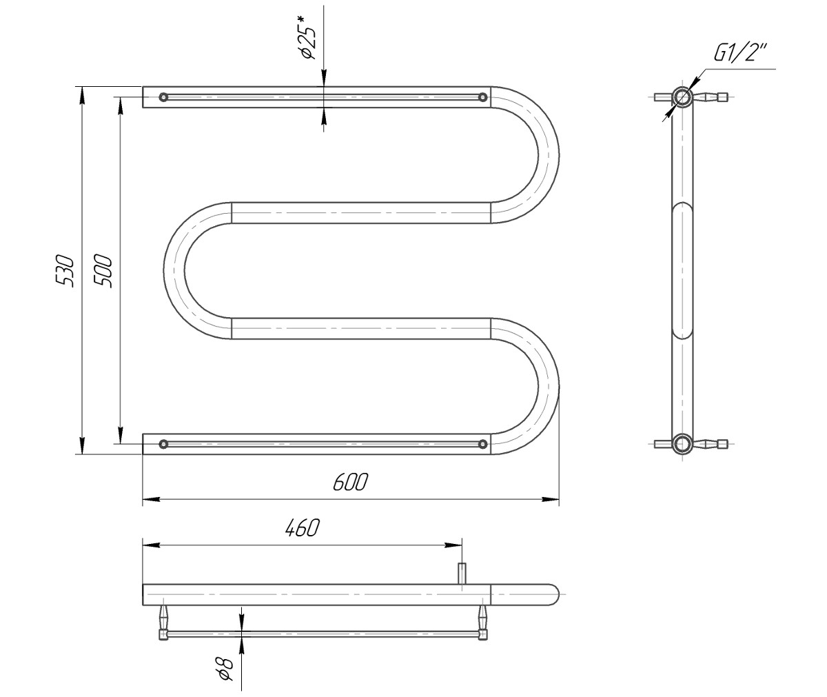 Полотенцесушитель Змейка 25 с полкой производственного предприятия Mario изготовлен из нержавеющей стали АІSI 304 может быть оборудован электрическим теном.