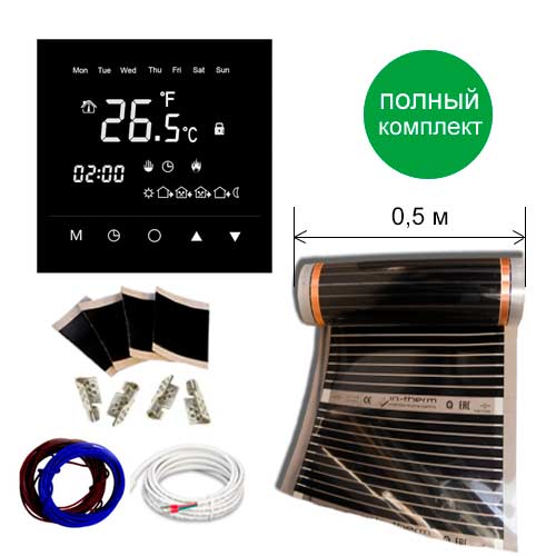 Комплект c программируемым терморегулятором с сенсорным экраном (черный) инфракрасного пленочного теплого пола для монтажа под ламинат, линолеум, ковролин на основе нагревательной инфракрасной пленки IN-Therm 220W T305 шириной 50 см, также в комплекте датчик температуры пола, клеммы, битумный изолятор и провода питания (все материалы необходимые для монтажа).