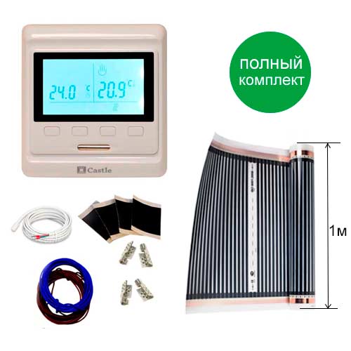 Комплект c программируемым терморегулятором с двумя датчиками (пол + воздух) инфракрасного пленочного теплого пола для монтажа под ламинат, линолеум, ковролин на основе нагревательной инфракрасной пленки Korea Heat 200W KH-310 шириной 100 см, также в комплекте датчик температуры пола, клеммы, битумный изолятор и провода питания (все материалы необходимые для монтажа).
