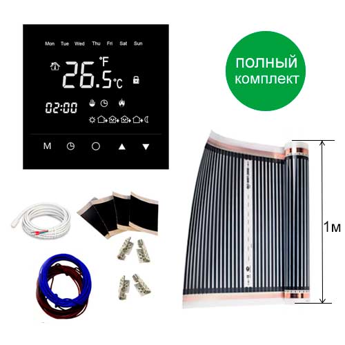 Комплект c программируемым терморегулятором с сенсорным экраном (черный) инфракрасного пленочного теплого пола для монтажа под ламинат, линолеум, ковролин на основе нагревательной инфракрасной пленки Korea Heat 200W KH-310 шириной 100 см, также в комплекте датчик температуры пола, клеммы, битумный изолятор и провода питания (все материалы необходимые для монтажа).