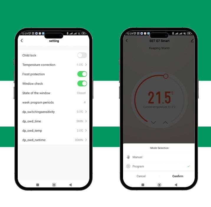 Для контролю та керування терморегулятором використовуються безкоштовні додатки Smart Life та Tuya Smart. Додатки розроблені та підходять для управління великою кількістю опалювальної та побутової техніки. Це дозволяє об’єднати декілька пристроїв в одному додатку, що дуже зручно. Додаток встановлюється на систему IOS або Android.