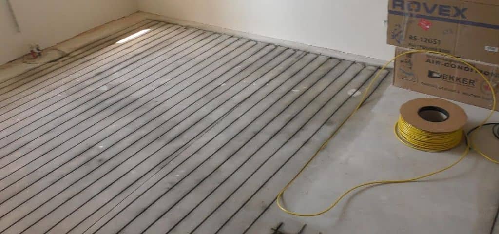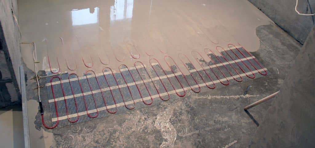 - Оцените возможность поднятия уровня пола. Когда существует возможность или необходимость поднятия уровня пола на 1-3см, стоит рассмотреть вариант установки кабеля/мата в стяжку или водяного теплого пола.