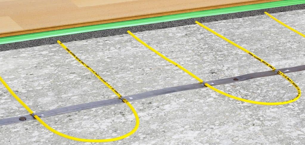 - Нагревательный кабель/мат в стяжку. Этот способ устройства теплого пола под ламинат наименее распространен. Это связано прежде всего с особенностями монтажа и эксплуатации. Монтаж в стяжку подразумевает поднятие уровня пола на 1-3см, это не всегда возможно и целесообразно делать. Работы по заливке стяжки увеличивают стоимость монтажа. Длительное время высыхания стяжки оттягивает завершение ремонта. В процессе эксплуатации, подложка, которая укладывается перед установкой ламината, блокирует часть тепла. При такой конструкции поверхность пола будет то теплой, то холодной. Несмотря на высокую надежность такой системы, из-за наличия существенных недостатков, использование нагревательного кабеля/мата в стяжку для устройства теплого пола под ламинат встречается редко.